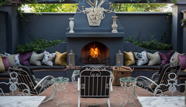 Walking through the main hallway from the main lounge, one will pass the beautifully coral decorated room, where breakfast is served on chillier mornings, leading out to a patio section with a fireplace, marble table tops and snug corner couches.