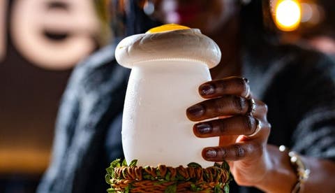 Another popular pick, the castle of good hope, is topped with Fanta Grape foam and comes with handcuffs. And if you order the sky god, it arrives raining.