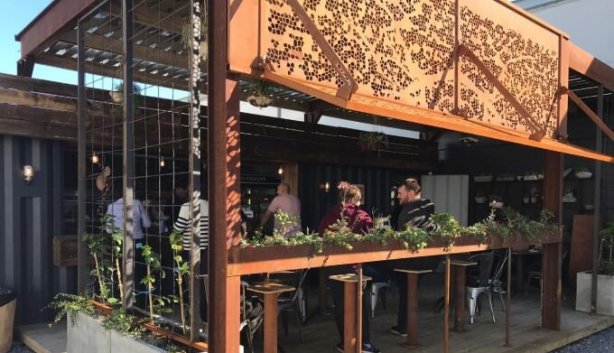 Along a pretty, pot-lined garden pathway leading through a business park in the Strand, there’s a small haven of green tranquility housed in a well-designed, converted ship container. The steel box is now a hip matt-black and wooden space, with a rustic laser-cut screen and long trough filled with succulents. Plants decorate the walls and hang from the ceilings, and there are tables and chairs inside the space and at the coffee bar.