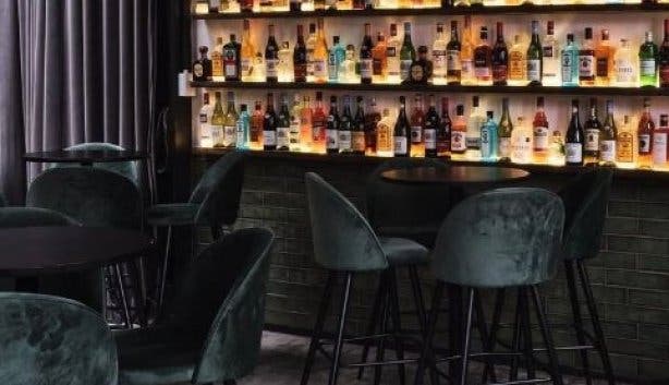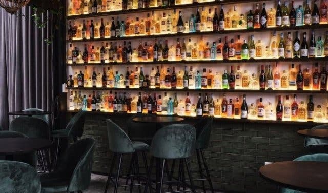 The wall of illuminated bottles adds a fresh feel to the intimate, moody social bar. Image: Loubar