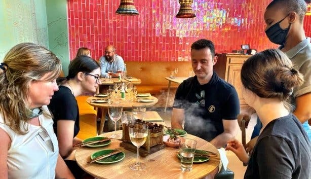 Anyone who has followed a low carb lifestyle will know the trials of the humble cauliflower and finding new ways to enjoy it. Here, it’s elevated once more to a lofty state: smoked and rubbed with bastourma (a spice paste of fenugreek, black pepper, paprika, cumin, coriander, allspice and a few other secrets), with pistachios and yoghurt dressing. It’s presented in a bowl lined with translucent paper inscribed in Arabic – the attention to detail is meticulous and extends to plating on metallics and bright ceramics by Mervyn Gers.