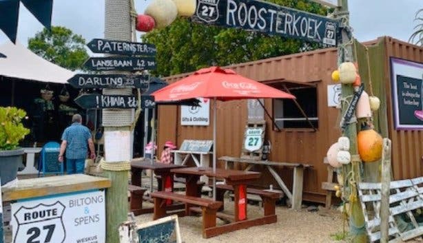 A wooden sign mounted above the entrance welcomes you to Route R27 Roosterkoek, a rustic eatery perfect for hungry travellers. It has a simple tarpaulin-covered seating area with wooden benches and bar stools set over pebbles. A collection of old, worn-out fishing gear (in keeping with the West Coast aesthetic) is scattered around the edges and draped across the side of the entrance walls.