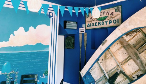 The main dining room at Santorini depicts a street style taverna with its street signs and greenery covering the walls. The upper level has a large feature wall painted with a sea view, a wooden boat mounted to a side wall, and blue and white flags crisscrossing the ceiling. Plus, join a plate-smashing event every month.