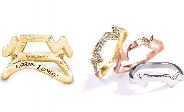 Inspired by the mountain’s famous silhouette, the Table Mountain Ring features 27 pavé-set diamonds and is available in white, yellow or rose gold, with the option of a brilliant-cut diamond in a Swiss setting to symbolise the Table Mountain Aerial Cableway. See the Table Mountain Ring.