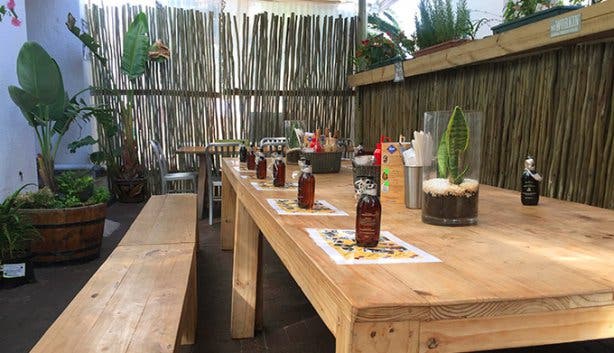 The unassuming restaurant is packed in among the Atlantic Seaboard suburb’s crush of hair salons, grocers, Chinese shops and cafés; but as the name promises, beyond its front door, a super spacious backyard area explodes out from the beach-chic interior of the eatery and settles in among towering residential blocks. Kitted out with picnic tables, a loungy cushioned nook and, of course, a sturdy braai, the laidback zone feels like a patch of barbecue heaven in the midst of a real urban jungle. It’s the sort of place where it feels right to throw your feet up, drink a little too much karate-juice (brandy), eat with your hands and pop open that top button.
