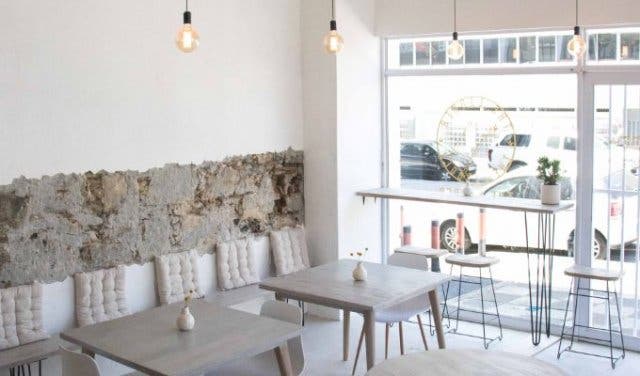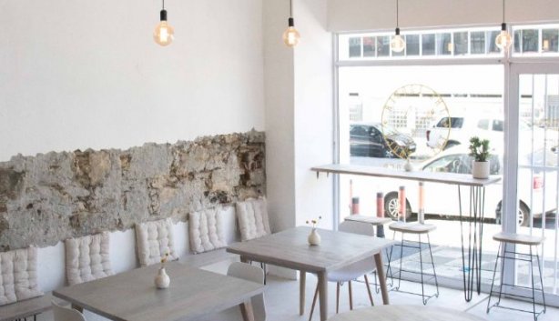 The Ladder is in a historical building which dates from the 1800s and was originally a storehouse which ended up being a brandy store. The space has been transformed into a light and bright city oasis. The decor is minimalistic with whitewashed walls and a neutral palette with some natural elements of wood and organic ceramic pieces and floral decor. Opened-up sections of the walls reveal the old brick and stonework.