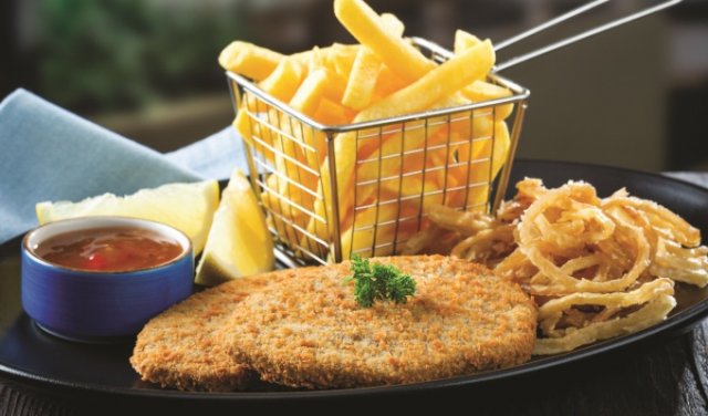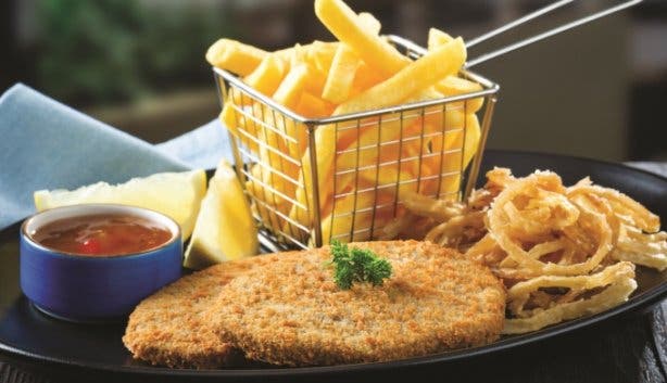 The Veggie Schnitzel is a crumbed schnitzel (at R82.90) that has a chicken-like texture and flavour, and is served with a sweet chilli sauce (it also comes with sides of chips and onion rings).