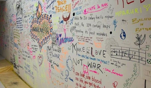 The Church Project, in Church Street, is an unconventional space centered around the nexus of politics, art and life. Its new exhibition, titled “Say No To War”, allows visitors to graffiti the walls, using the art materials supplied, so you can express your sentiments towards war.