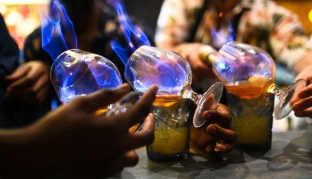 Before you sip, the waiter sets your tequila alight with a handheld blowtorch before encouraging the flames by squeezing over the zest of an orange peel. While the fire grows, the waiter finishes off your cocktail with a dash of cinnamon powder for an added bit of sparkle.